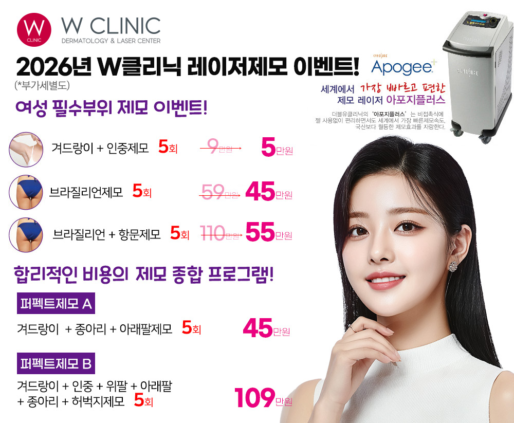 아포지플러스 레이저를 이용한 선진국 트랜드의 레이저제모- 브라질리언, 항문제모, 겨드랑이, 팔다리제모 등 제모클리닉을 선도하는 뛰어난 시술을 만나보세요.